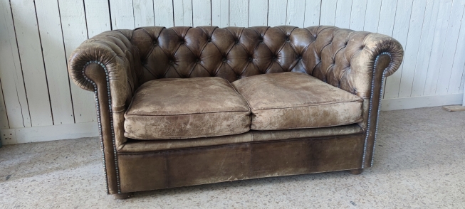 Sofá vintage em pele castanha modelo Chesterfield